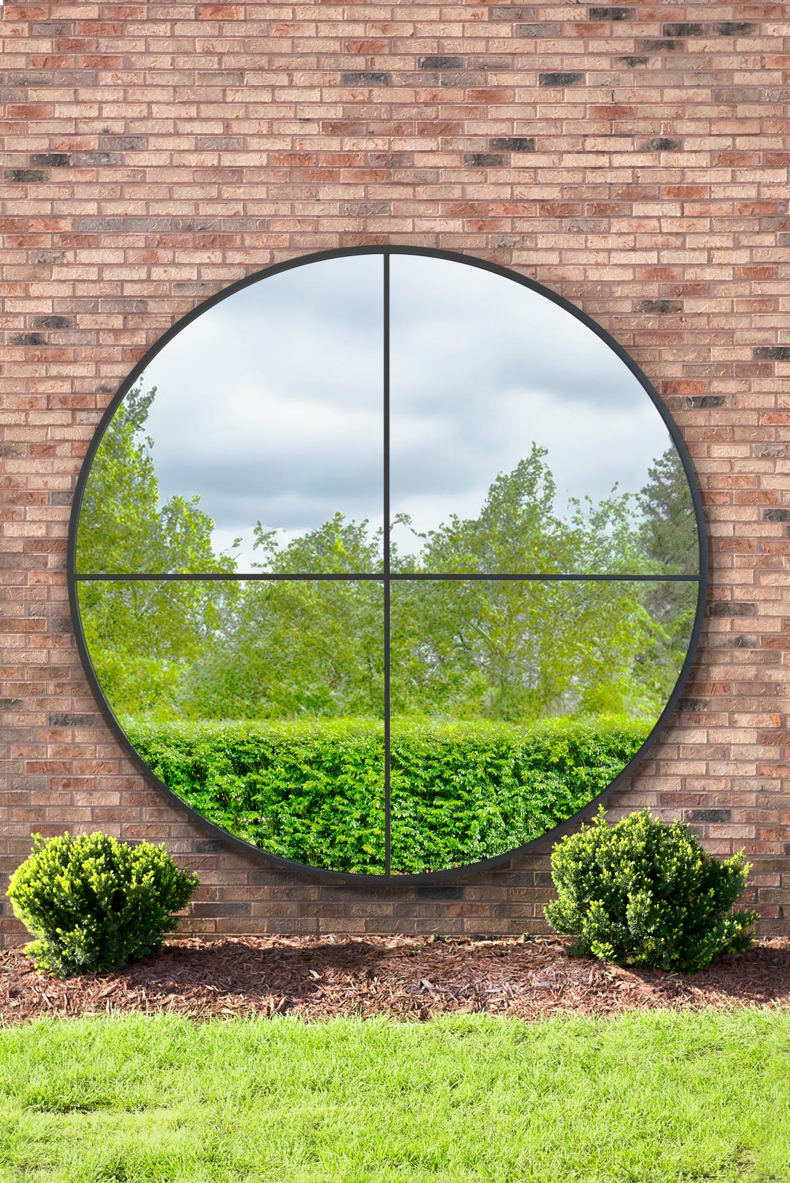 This extra-large oversized round mirror features a sleek black steel frame with intersecting crossbars that create a striking windowpane look. It’s perfect for brightening indoor or outdoor walls and adds a touch of modern industrial charm.